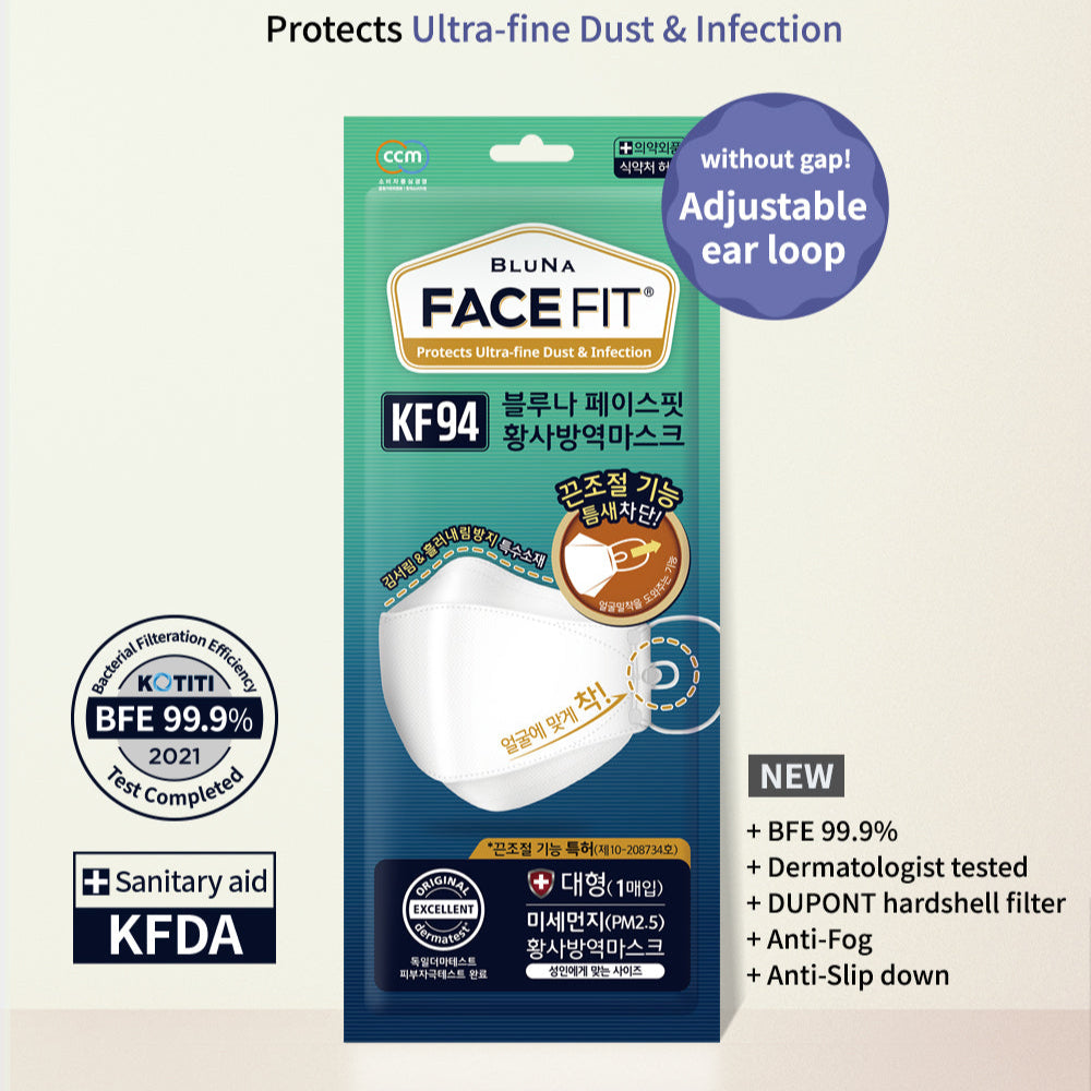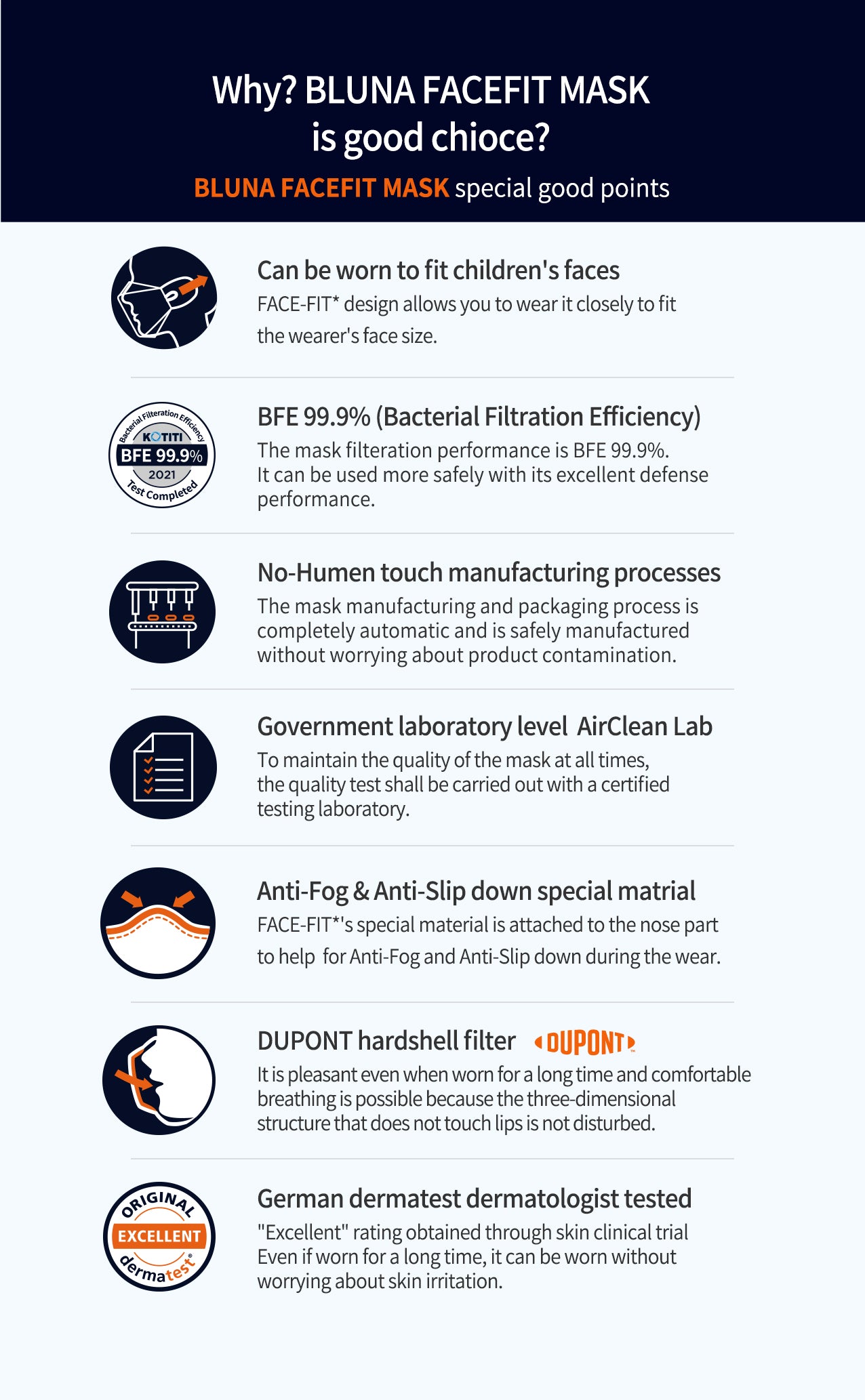 - BFE (efficacité de filtration bactérienne) 99,9 % testé par KOTITI, Corée