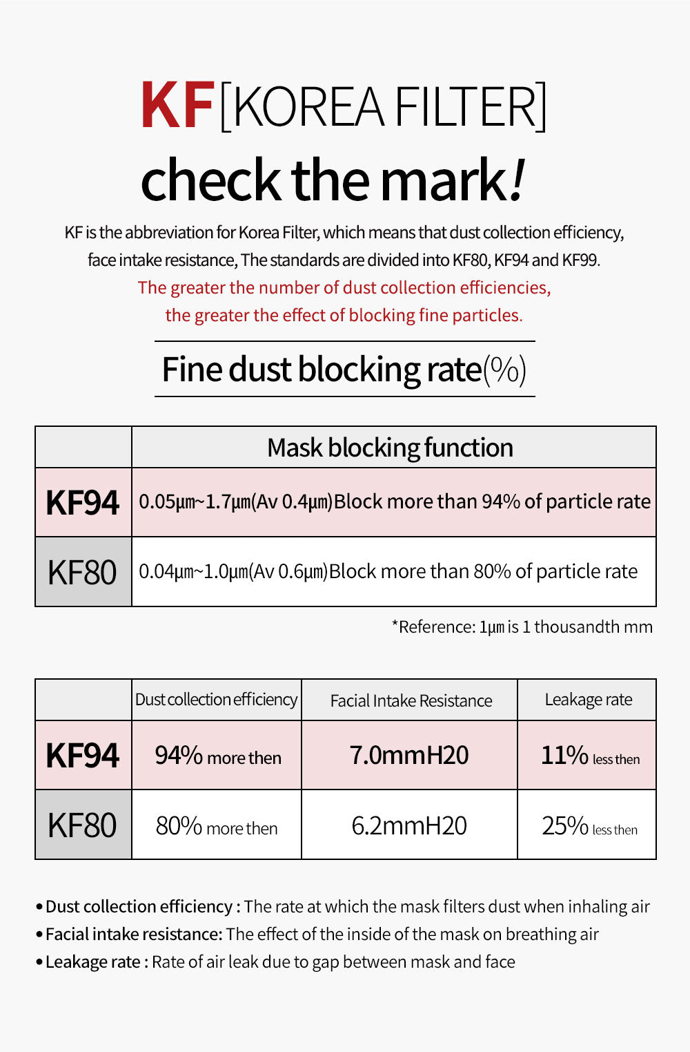 - KF signifie « filtre coréen ». 94 indique l'efficacité de filtration (la capacité du masque à filtrer les particules), qui est de 94 %.