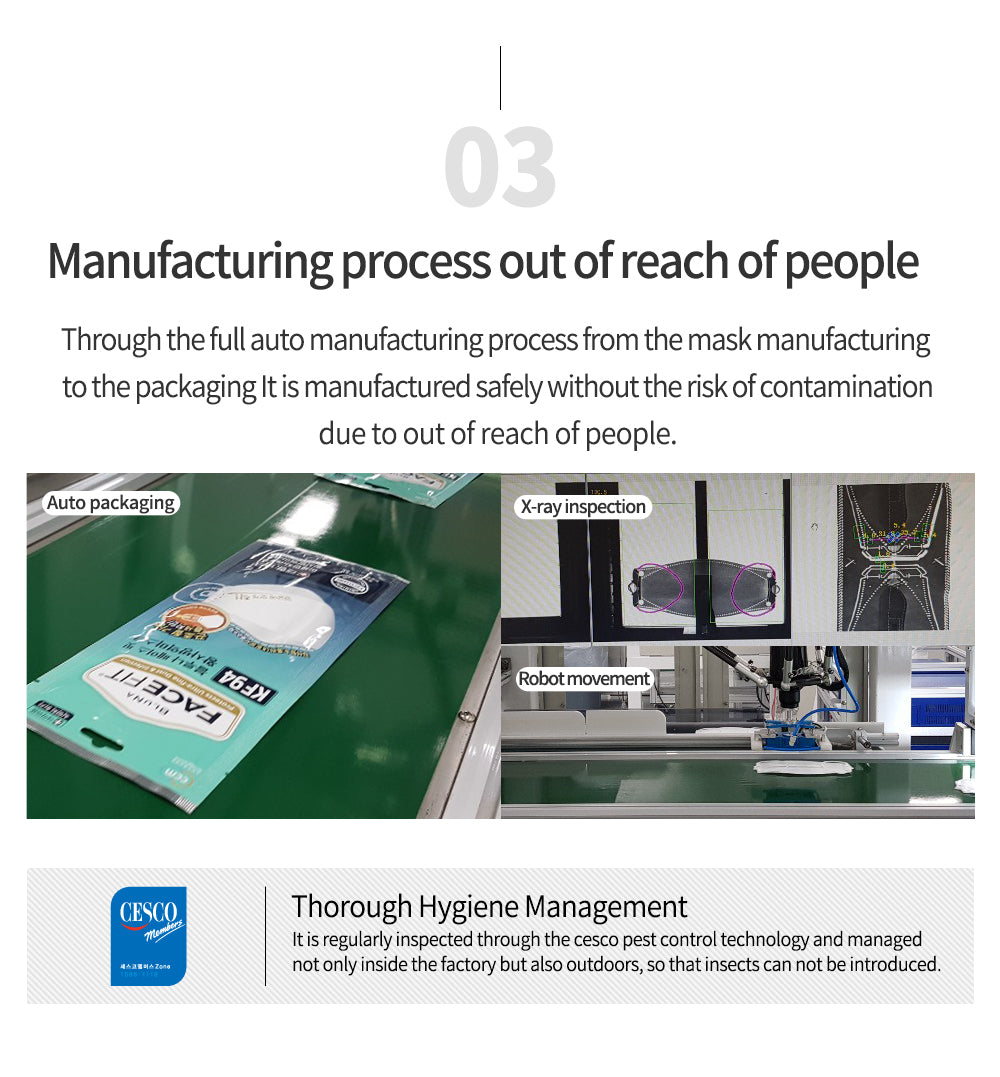- Notre processus de fabrication entièrement automatisé garantit une hygiène optimale et une absence totale de contamination. De plus, les masques sont emballés individuellement.
