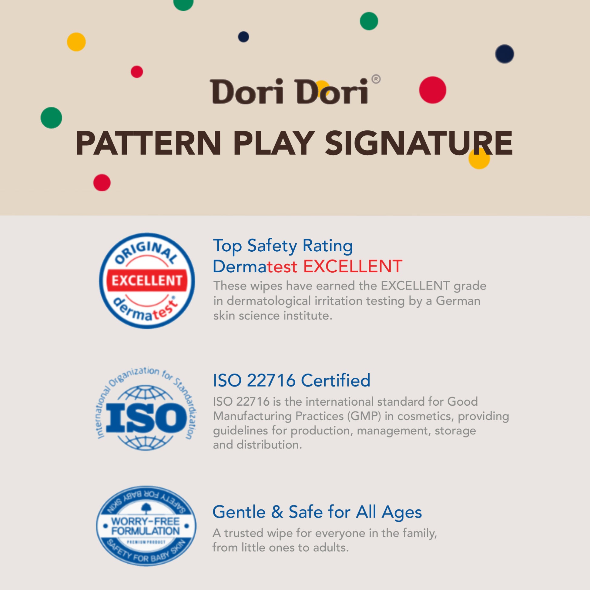 Dori Dori Pattern Play Wet Wipes are gentle, skin-friendly wipes designed for babies and the entire family. They have received an EXCELLENT rating in dermatological skin irritation testing conducted by a German dermatological research institute and are manufactured in accordance with ISO 22716 cosmetic Good Manufacturing Practice standards, making them a reliable choice for families seeking a worry-free, all-purpose wet wipe.