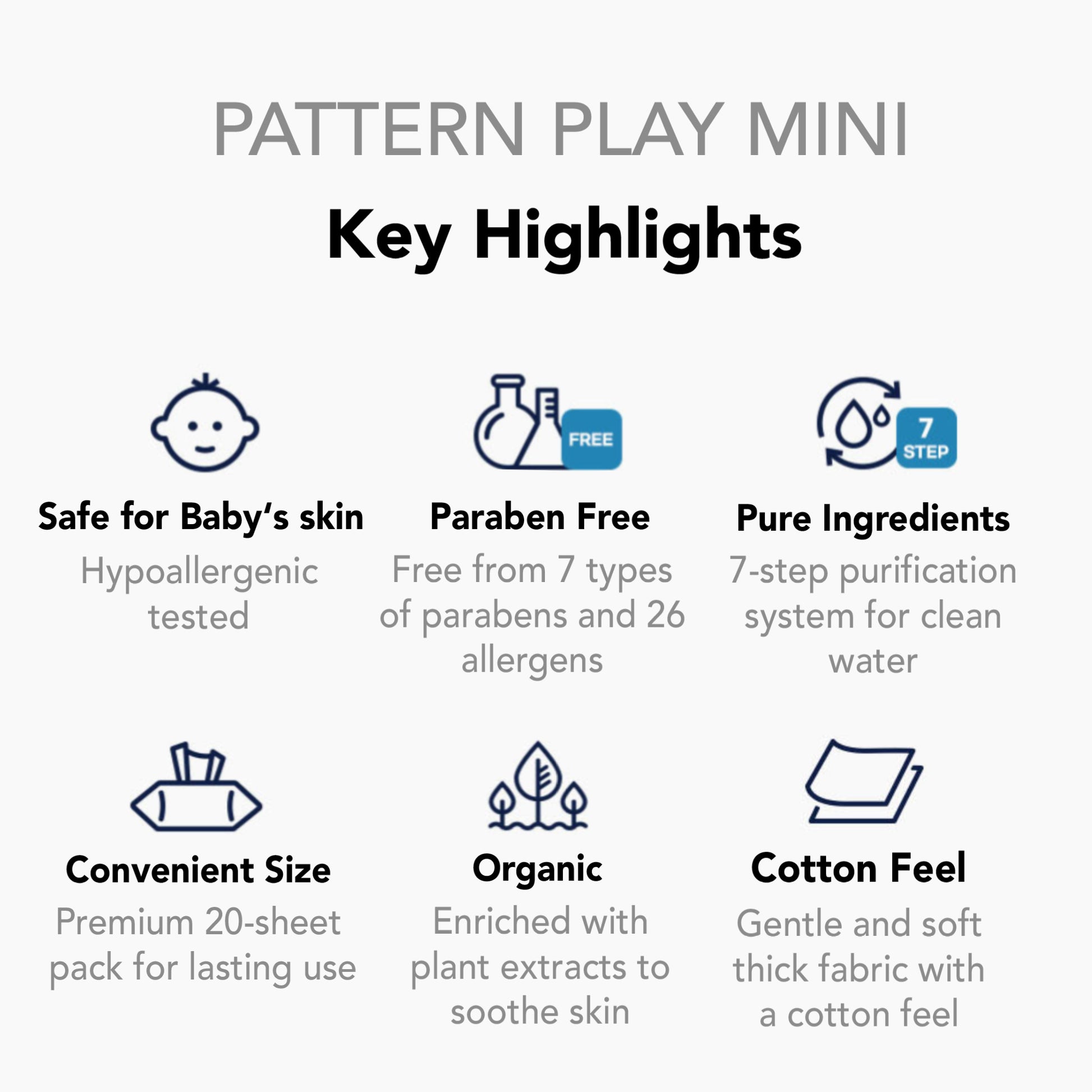 The fabric used in Pattern Play Wet Wipes is a premium spunlace material sterilized using high-temperature, high-pressure steam above 100°C. This process removes fine dust and impurities from deep within the fibers. The spunlace method, which bonds the fabric using high-pressure purified water, enhances moisture retention, durability, and softness. The finely structured texture feels smooth against the skin, produces minimal lint, and delivers excellent cleansing performance. To support skin comfort, the wipes contain plant extracts known for their moisturizing and soothing properties. The formula is mildly acidic, maintaining a pH level between 4 and 5 to closely match the natural pH of baby skin. This helps maintain the skin barrier and allows for safe, frequent use from newborns to adults.
