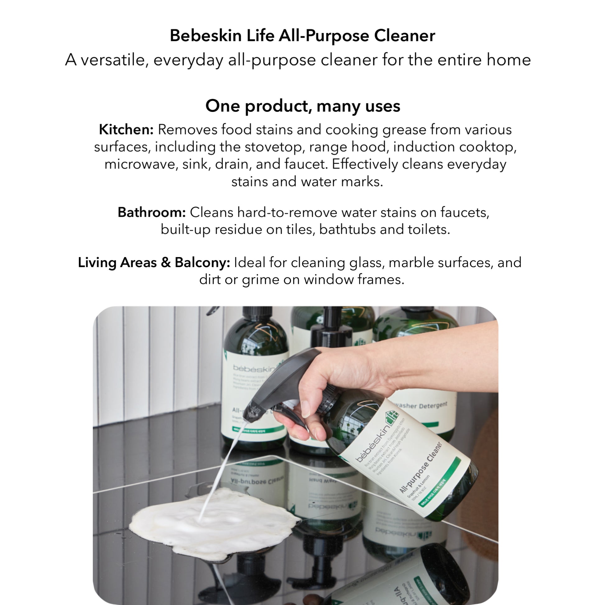 Bebeskin Life All Purpose Cleaner is a thoughtfully formulated, high-performance household cleaner that combines honest cleaning power with a refreshing, natural fragrance.