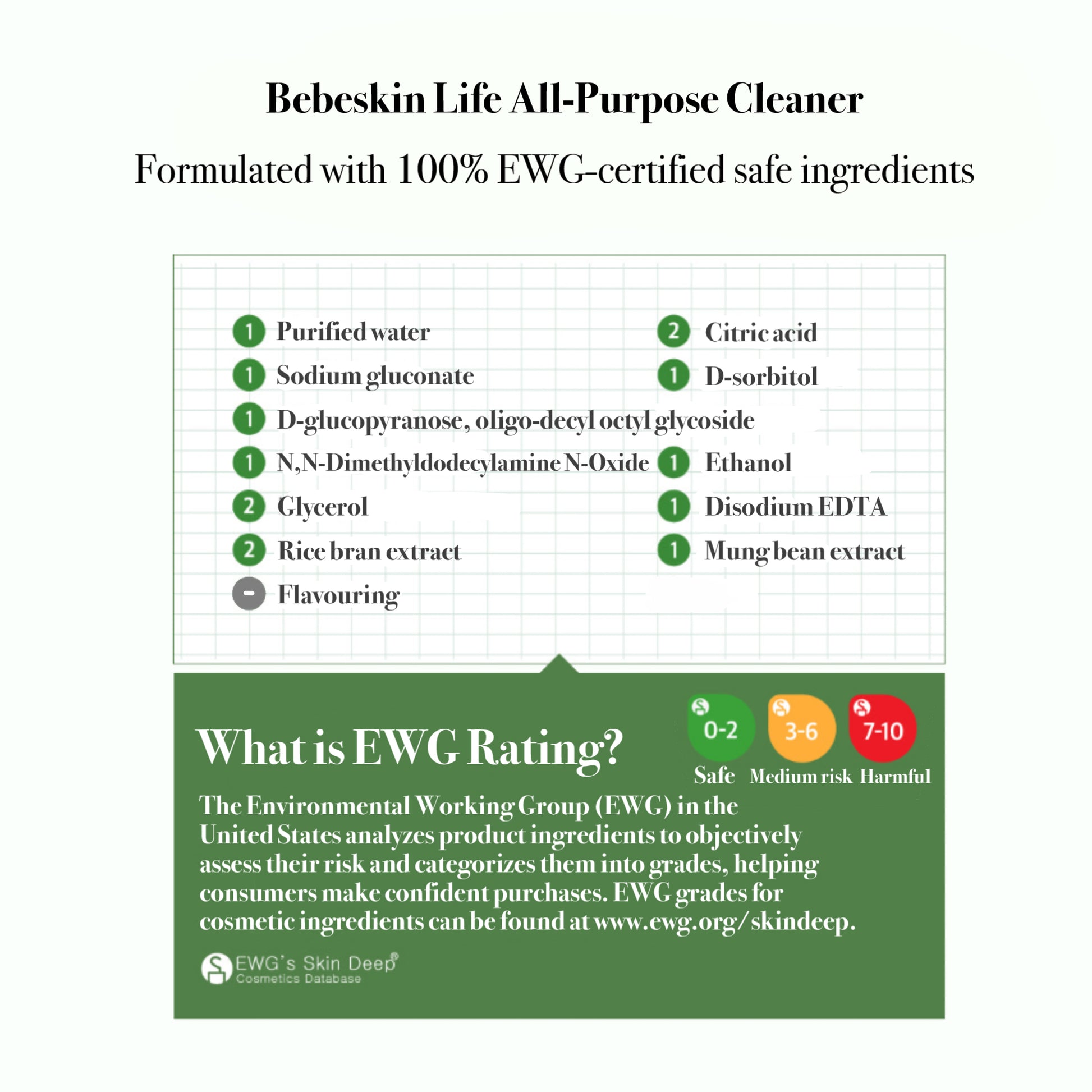 Manufactured under strict ISO 22716 Cosmetic-GMP standards and formulated exclusively with 100% EWG Green Grade ingredients , Bebeskin Life All-Purpose Cleaner delivers powerful, safe, and refreshingly refined cleaning for every corner of the home. 500 ml
