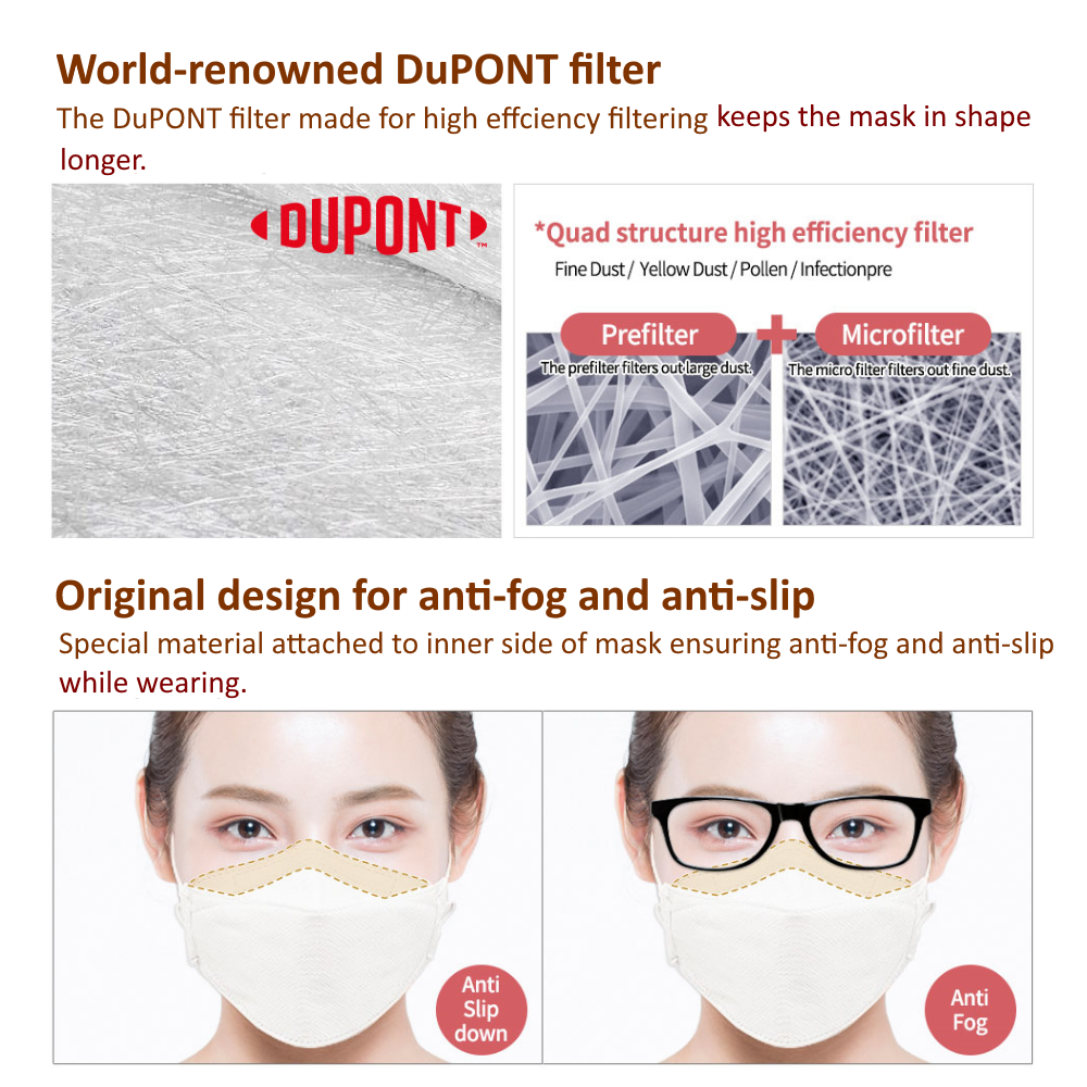 - Renowned DuPont filter with three-dimensional structure allows easy breathing and comfortable wearing.