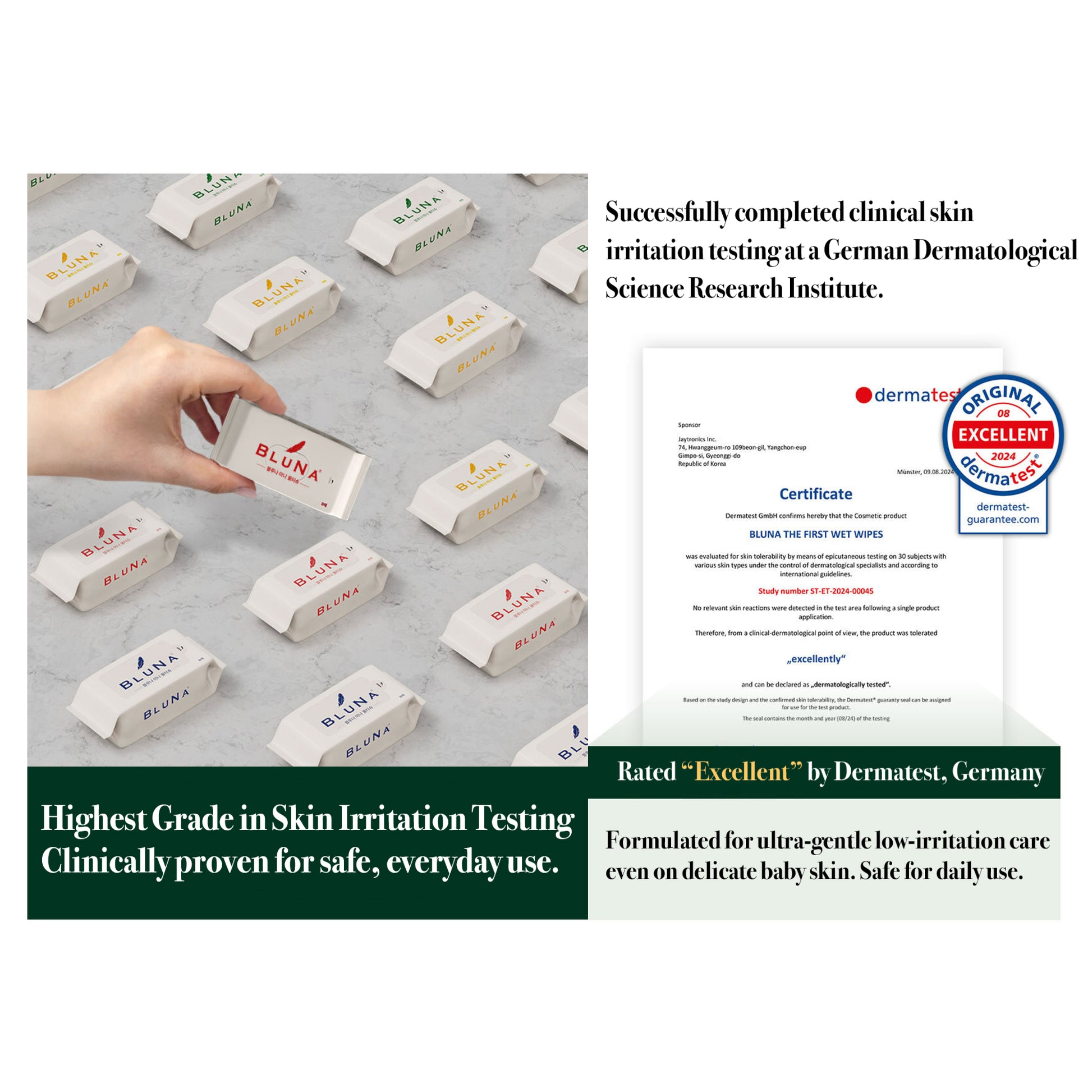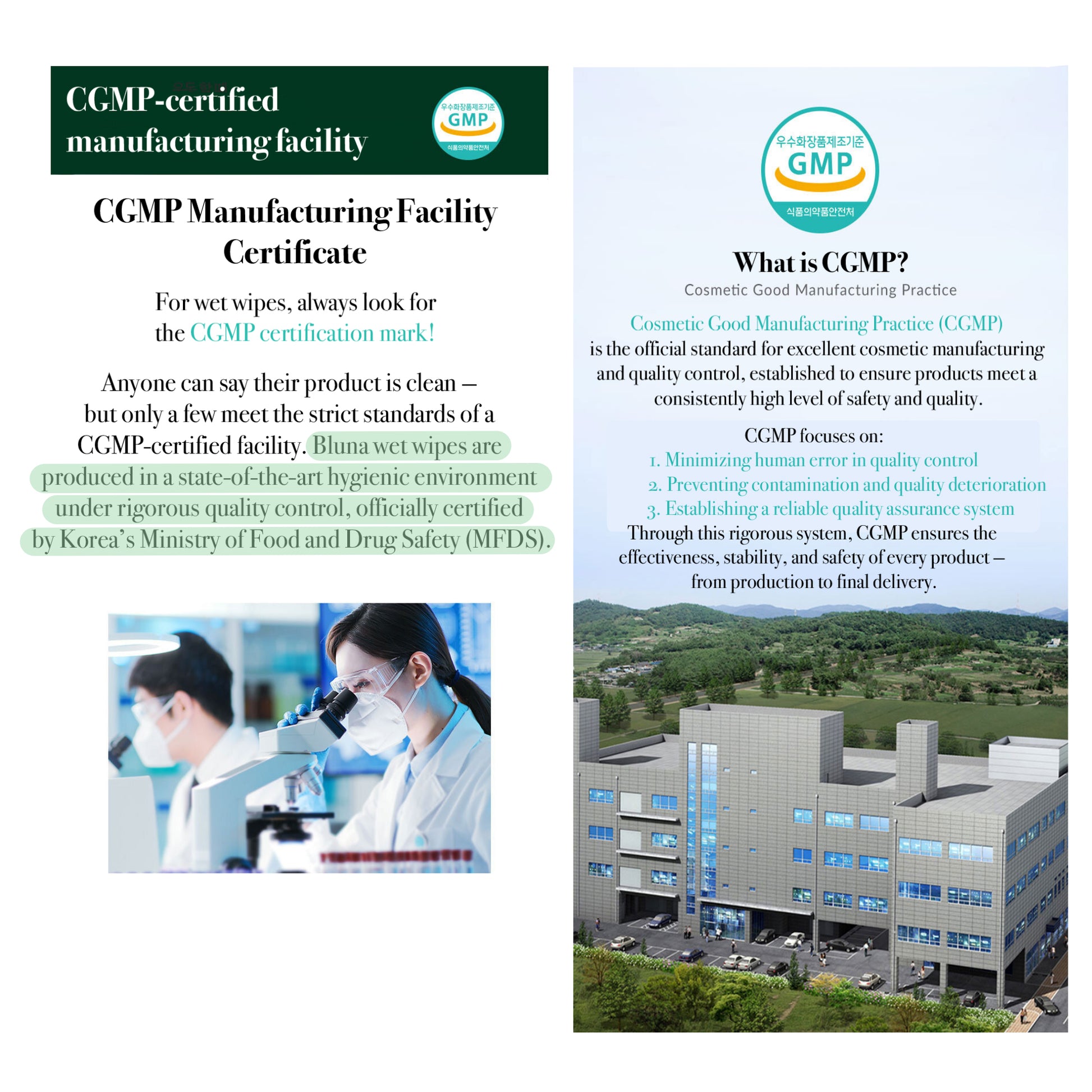 Manufactured under strict CGMP standards in line with the principles of the Ministry of Food and Drug Safety, Bluna Mini Wet Wipes use only carefully verified, reliable ingredients.