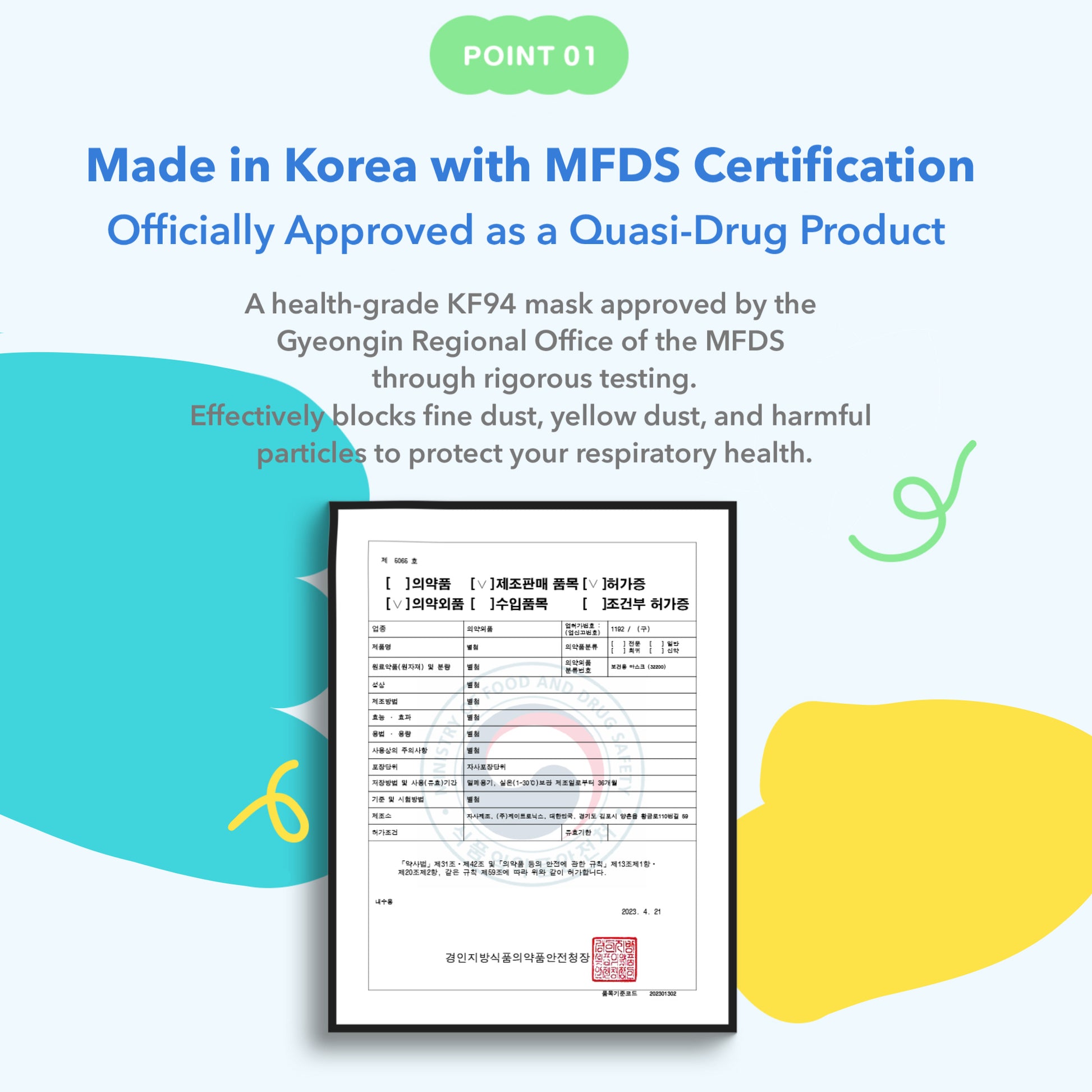 Thinner and lighter than conventional KF94 masks, it is officially approved as a non-drug health product by the Ministry of Food and Drug Safety and rigorously certified through the Gyeongin Regional Food and Drug Administration.